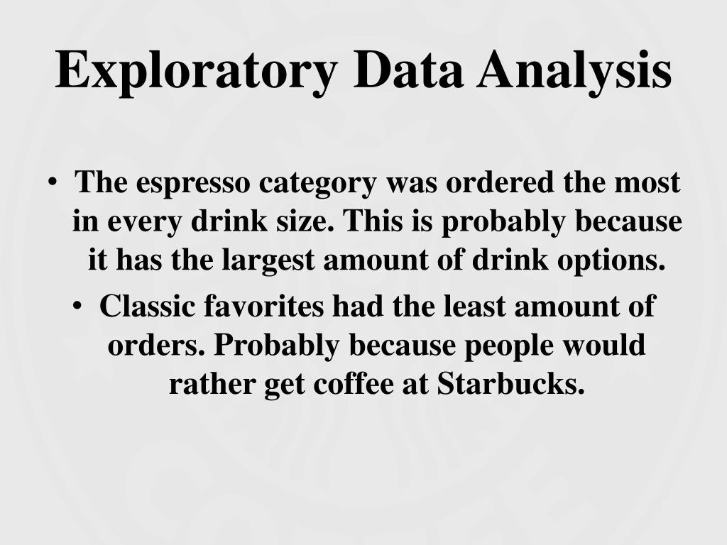 Exploratory Data Analysis • The espresso category was ordered the most in every drink size. This is probably because it has the largest amount of drink options. • Classic favorites had the least amount of orders. Probably because people would rather get coffee at Starbucks.