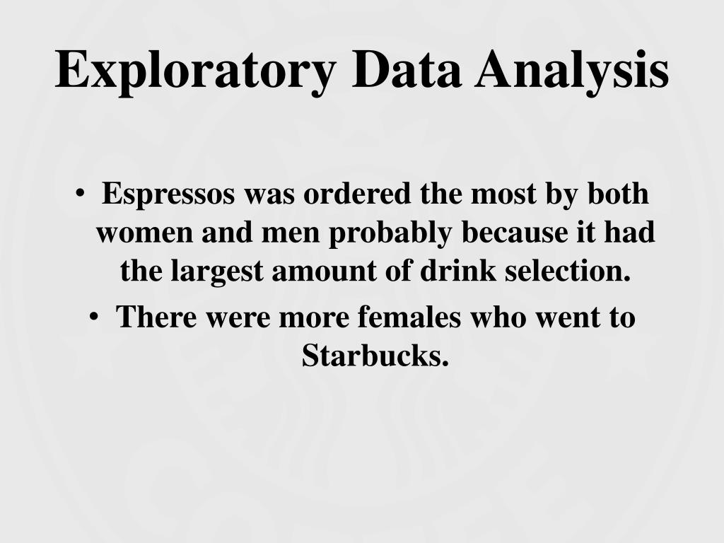 Exploratory Data Analysis • Espressos was ordered the most by both women and men probably because it had the largest amount of drink selection. • There were more females who went to Starbucks.