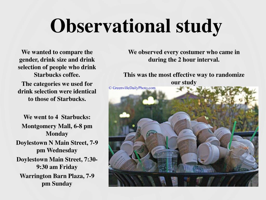 Observational study We wanted to compare the gender, drink size and drink selection of people who drink Starbucks coffee. The categories we used for drink selection were identical to those of Starbucks. We went to 4 Starbucks: Montgomery Mall, 6-8 pm Monday Doylestown N Main Street, 7-9 pm Wednesday Doylestown Main Street, 7:30- 9:30 am Friday Warrington Barn Plaza, 7-9 pm Sunday We observed every costumer who came in during the 2 hour interval. This was the most effective way to randomize our study
