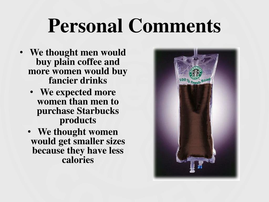 Personal Comments • We thought men would buy plain coffee and more women would buy fancier drinks • We expected more women than men to purchase Starbucks products • We thought women would get smaller sizes because they have less calories
