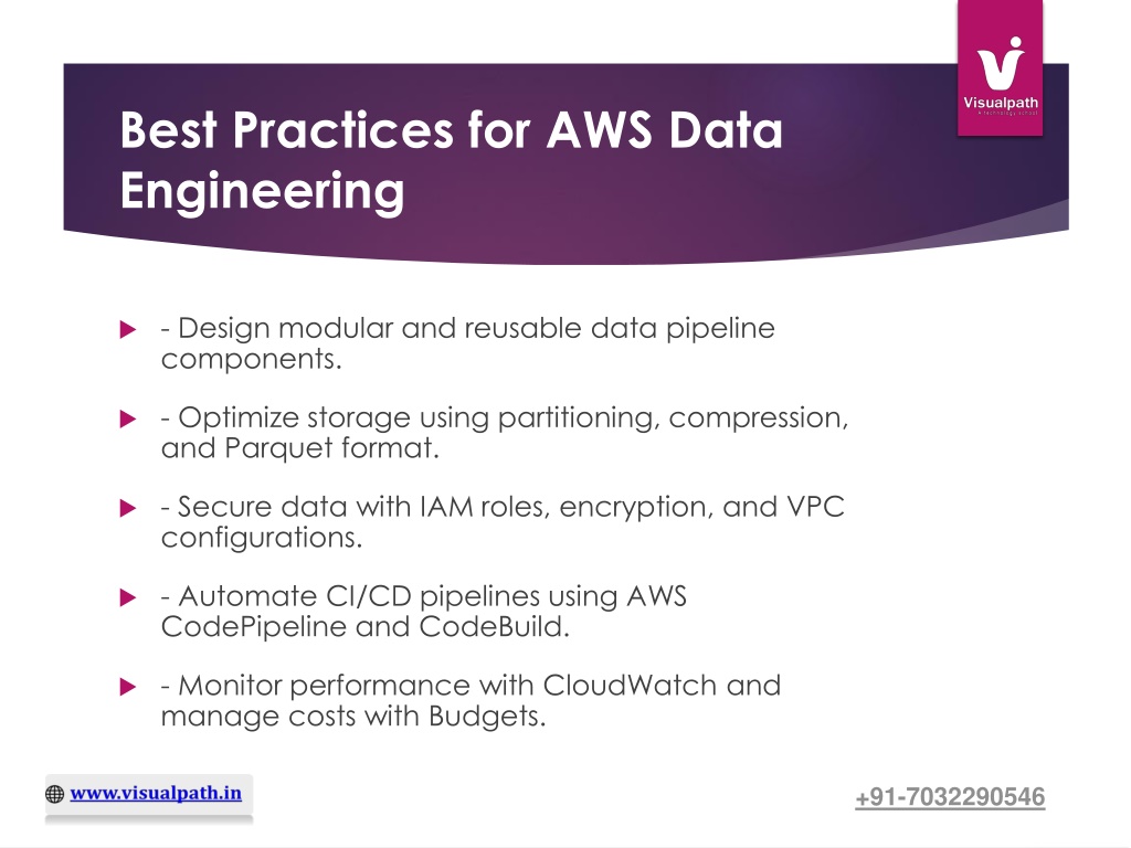 7. - Design modular and reusable data pipeline components. - Optimize storage using partitioning, compression, and Parquet format. - Secure data with IAM roles, encryption, and VPC configurations. - Automate CI/CD pipelines using AWS CodePipeline and CodeBuild. - Monitor performance with CloudWatch and manage costs with Budgets. Best Practices for AWS Data Engineering +91-7032290546