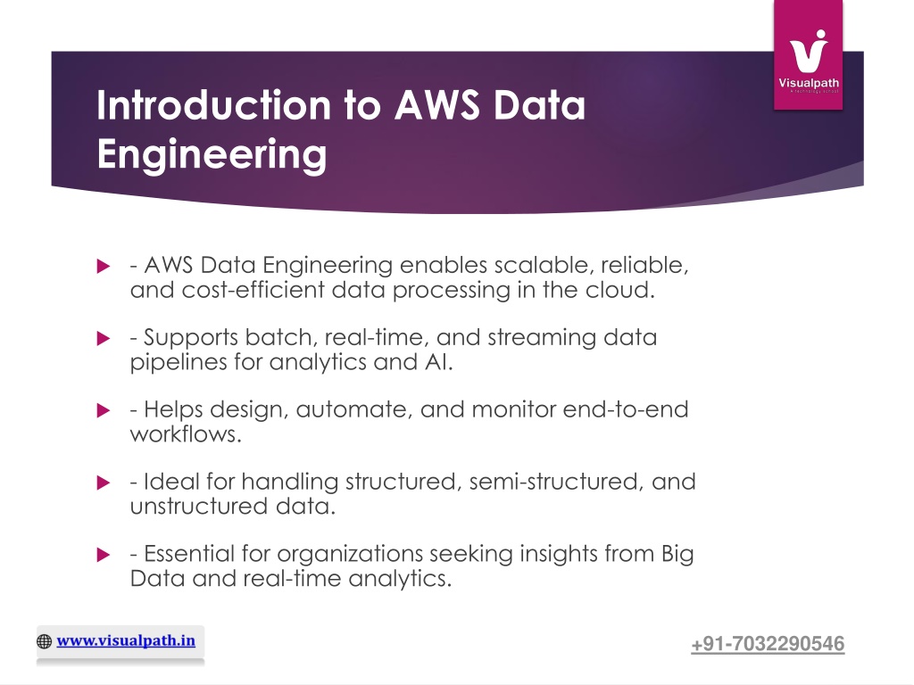 2. - AWS Data Engineering enables scalable, reliable, and cost-efficient data processing in the cloud. - Supports batch, real-time, and streaming data pipelines for analytics and AI. - Helps design, automate, and monitor end-to-end workflows. - Ideal for handling structured, semi-structured, and unstructured data. - Essential for organizations seeking insights from Big Data and real-time analytics. Introduction to AWS Data Engineering +91-7032290546