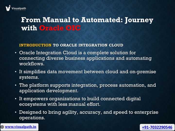Advance your IT skills with Oracle Integration Cloud Online Training at Visualpath. Our OIC Training Online features expert-led sessions, hands-on exercises, and real-time projects to develop practical, industry-ready expertise. Gain global recognition, enhance your career prospects, and become a sought-after professional in cloud integration and enterprise solutions. Call 91-7032290546 today.<br>Visit:https://www.visualpath.in/oracle-integration-cloud-training.html<br>WhatsApp: https://wa.me/c/917032290546 <br>Blog: https://visualpathblogs.com/oracle-integration-cloud-oic/<br>