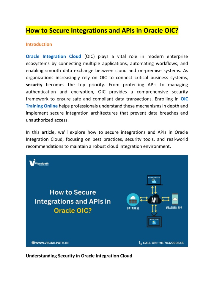 Leveraging Oracle API Gateway Analytics for deeper visibility into API performance and usage patterns. These enhancements help build a multi-layered defense, protecting data flows from both internal and external threats. Conclusion Securing integrations and APIs in Oracle Integration Cloud is not just about applying encryption or authentication —it’s about creating a comprehensive, layered security approach that covers every stage of integration design, deployment, and monitoring. By combining built-in OIC security tools with best practices like token rotation, data masking, and role-based access, businesses can confidently build integrations that are safe, compliant, and future-ready. In a cloud-driven world, security is no longer optional —it’s the foundation of trust and success in every Oracle Integration Cloud environment. TRENDING COURSES: AWS Data Engineering, GCP Data Engineer, SAP PaPM. Visualpath is the Leading and Best Software Online Training Institute in Hyderabad. For More Information about Oracle Integration Cloud Contact Call/WhatsApp: +91-7032290546 Visit: https://www.visualpath.in/oracle-integration-cloud-training.html