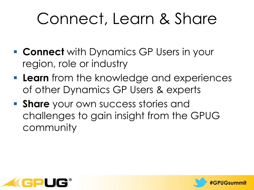 Connect, Learn & Share • Connect with Dynamics GP Users in your region, role or industry • Learn from the knowledge and experiences of other Dynamics GP Users & experts • Share your own success stories and challenges to gain insight from the GPUG community
