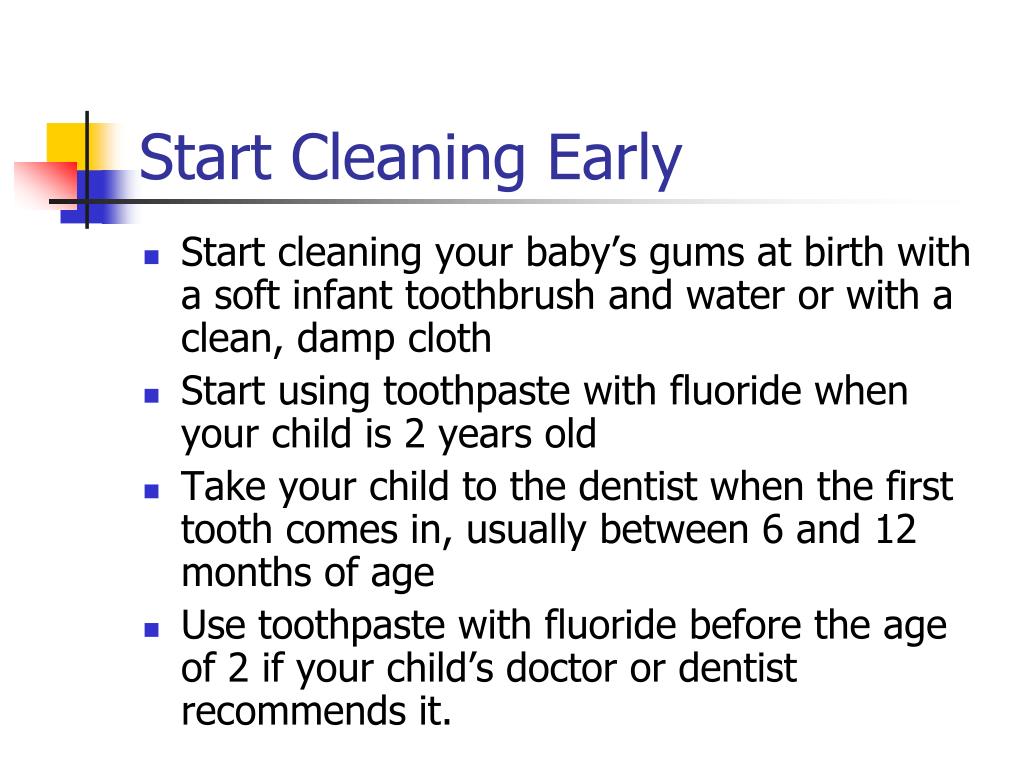 Start Cleaning Early • Start cleaning your baby’s gums at birth with a soft infant toothbrush and water or with a clean, damp cloth • Start using toothpaste with fluoride when your child is 2 years old • Take your child to the dentist when the first tooth comes in, usually between 6 and 12 months of age • Use toothpaste with fluoride before the age of 2 if your child’s doctor or dentist recommends it.