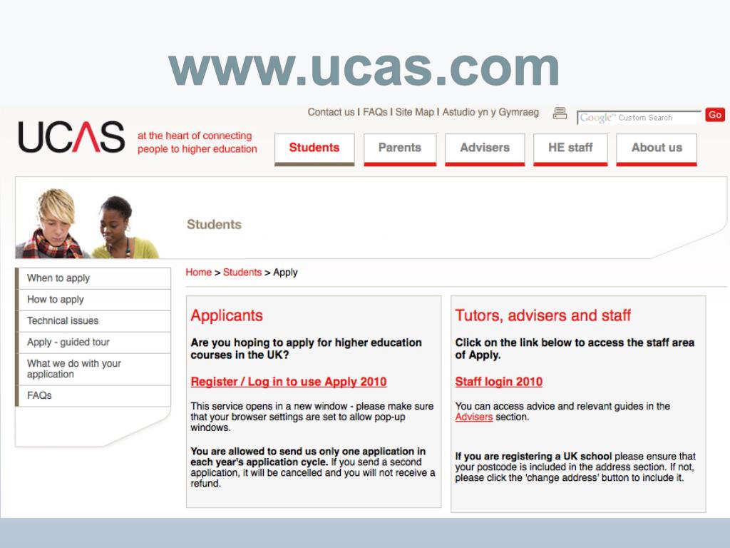 The 10 Step Process • Potential applicant conducts research • Registers online with UCAS Apply • Completes form and processes payment • Academic reference added by WAB • WAB sends form electronically to UCAS • UCAS processes form and forwards to chosen universities • Universities submit decisions (offer or unsuccessful) • Applicant views decisions on Track • Applicant replies to offers on Track (Firm / Insurance) • Universities confirm places when results are released