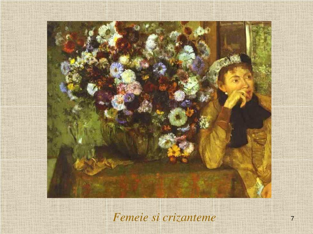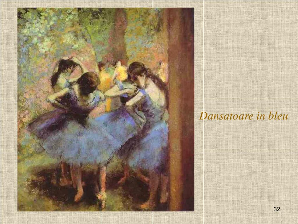 Hilaire Edgard De Gas (nume ce ulterior se schimbă in Degas)se naste in19 Iulie 1834 la Paris si moare in 27Septembrie 1917. Pictor francez ce a inceput cu academismul clasic ,pe care curând il abandonează, trecând la o tematică realistă din lumea balerinelor,modistelor,curselor de cai sau studierea corpului uman. Talent exceptional ,este unul din intemeietorii Impresionismului impreună cu Monet, Renoir,Pissaro.Foloseste uleiul, pastelurile si face si sculpturâ spre finalul vietii.Lasă o mostenire de circa 2000 de tablouri si câteva sculpturi.Initial incepe Facultatea de drept pe care o abandonează, dupa care incepe să facă copii după tablourile marilor maestrii .Se trage dintr-o familie burgheză instărită fiind al cincilea copil.In 1855 reuseste la Scoala de arte frumoase din Paris dar o abandonează si pleacă in Italia la Roma unde ia parte la cursurile de pictură la Villa Medicii..In 1859 revine in Franta unde vizitează asiduu Louvre-ul, unde il intâlneste pe Manet cu care se imprieteneste.Tot aici ii intâlneste pe Monet,Renoir,Sisley,Cezanne.Acesta e momentul când Degas rupe cu academismul clasic in pictură si trece la tematica realistă. După războiul franco-prusac1870-71pleacă in America la New Orleans,aici picteazâ tabloul “Vânzătorii de bumbac.”Intors in Paris isi consacră timpul balerinelor,modistelor si picteazâ “clasa de dans”Incepe sa participe la expozitiile impresionistilor ,prima dintre acestea declansând un scandal acid in cercurile criticii conservatoare in pictură.Participă la toate expozitiile si in sfârsit laudele incep să curgă. In ultima peroadă a vietii se retrage in Normandia ocrotit de credincioasa sa menajeră Zoe Closiet.Nu a fost căsătorit niciodată si nici nu se cunoaste vreo relatie stabilă si de durată.Din 1872 incepe să aibe probleme de vedere, nu mai vede in amurg ,boala se agravează,are probleme de depresie profundă in plus si hipoacuzie. In 27 Septembrie1917moare de pneumonie la vârsta de 83 de ani. .Mormântul său se află in Cimitirul Montmartre din Paris.