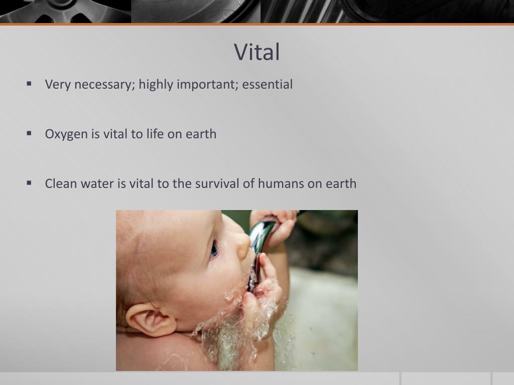 Vital • Very necessary; highly important; essential • Oxygen is vital to life on earth • Clean water is vital to the survival of humans on earth