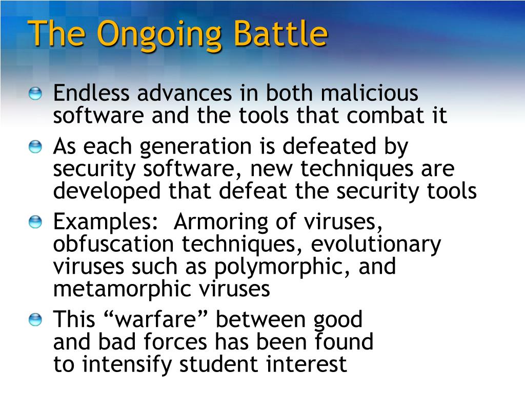 The Ongoing Battle • Endless advances in both malicious software and the tools that combat it • As each generation is defeated by security software, new techniques are developed that defeat the security tools • Examples: Armoring of viruses, obfuscation techniques, evolutionary viruses such as polymorphic, and metamorphic viruses • This “warfare” between good and bad forces has been found to intensify student interest