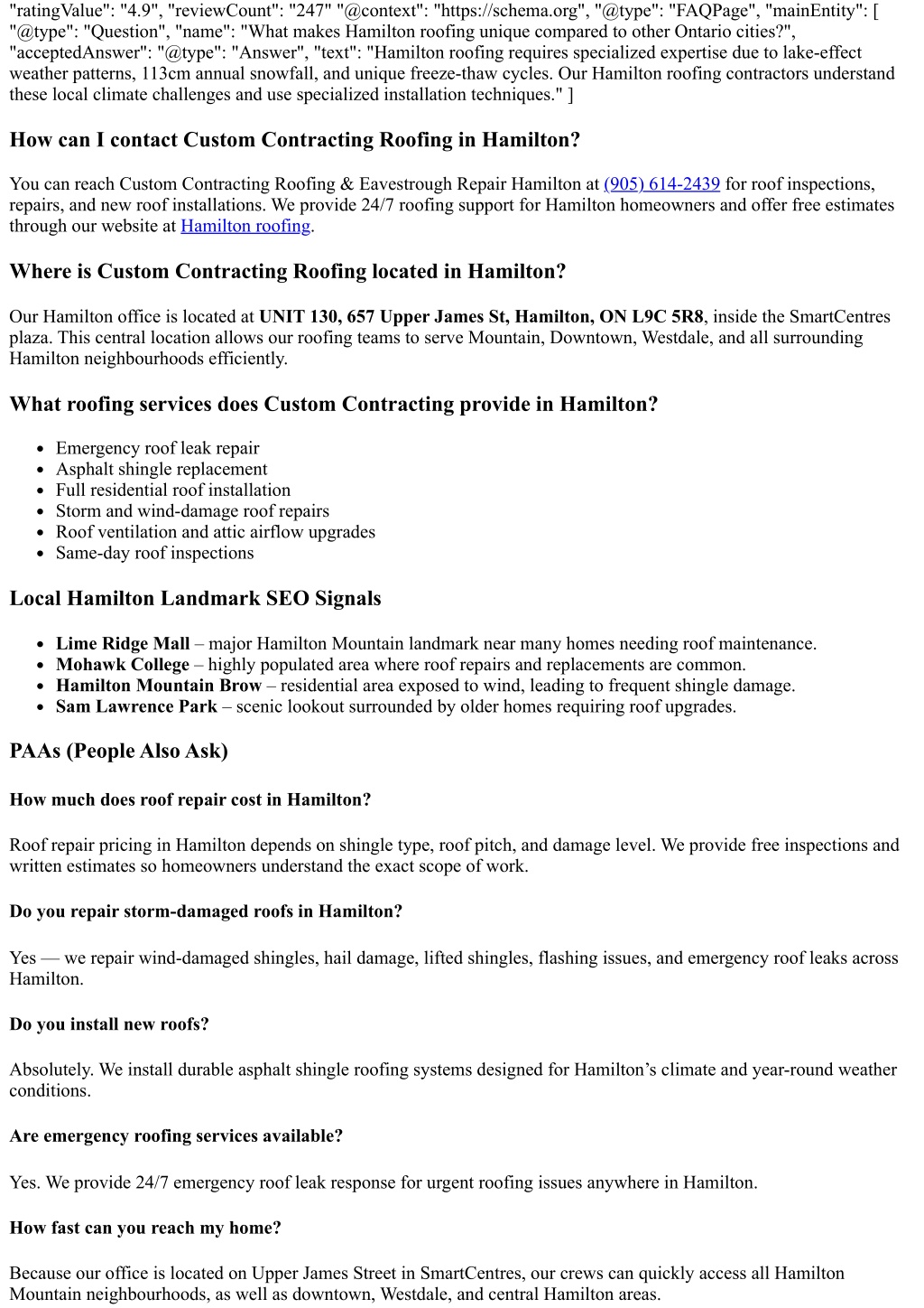 "ratingValue": "4.9", "reviewCount": "247" "@context": "https://schema.org", "@type": "FAQPage", "mainEntity": [ "@type": "Question", "name": "What makes Hamilton roofing unique compared to other Ontario cities?", "acceptedAnswer": "@type": "Answer", "text": "Hamilton roofing requires specialized expertise due to lake-effect weather patterns, 113cm annual snowfall, and unique freeze-thaw cycles. Our Hamilton roofing contractors understand these local climate challenges and use specialized installation techniques." ] How can I contact Custom Contracting Roofing in Hamilton? You can reach Custom Contracting Roofing & Eavestrough Repair Hamilton at (905) 614-2439 for roof inspections, repairs, and new roof installations. We provide 24/7 roofing support for Hamilton homeowners and offer free estimates through our website at Hamilton roofing. Where is Custom Contracting Roofing located in Hamilton? Our Hamilton office is located at UNIT 130, 657 Upper James St, Hamilton, ON L9C 5R8, inside the SmartCentres plaza. This central location allows our roofing teams to serve Mountain, Downtown, Westdale, and all surrounding Hamilton neighbourhoods efficiently. What roofing services does Custom Contracting provide in Hamilton? Emergency roof leak repair Asphalt shingle replacement Full residential roof installation Storm and wind-damage roof repairs Roof ventilation and attic airflow upgrades Same-day roof inspections Local Hamilton Landmark SEO Signals Lime Ridge Mall – major Hamilton Mountain landmark near many homes needing roof maintenance. Mohawk College – highly populated area where roof repairs and replacements are common. Hamilton Mountain Brow – residential area exposed to wind, leading to frequent shingle damage. Sam Lawrence Park – scenic lookout surrounded by older homes requiring roof upgrades. PAAs (People Also Ask) How much does roof repair cost in Hamilton? Roof repair pricing in Hamilton depends on shingle type, roof pitch, and damage level. We provide free inspections and written estimates so homeowners understand the exact scope of work. Do you repair storm-damaged roofs in Hamilton? Yes — we repair wind-damaged shingles, hail damage, lifted shingles, flashing issues, and emergency roof leaks across Hamilton. Do you install new roofs? Absolutely. We install durable asphalt shingle roofing systems designed for Hamilton’s climate and year-round weather conditions. Are emergency roofing services available? Yes. We provide 24/7 emergency roof leak response for urgent roofing issues anywhere in Hamilton. How fast can you reach my home? Because our office is located on Upper James Street in SmartCentres, our crews can quickly access all Hamilton Mountain neighbourhoods, as well as downtown, Westdale, and central Hamilton areas.