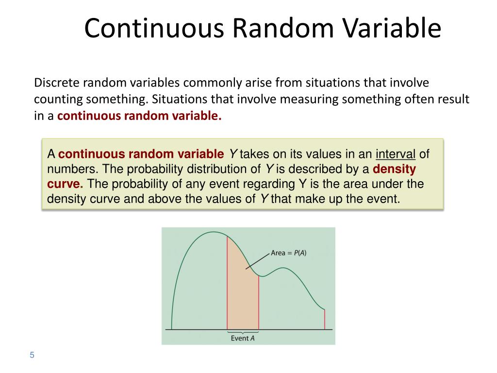 Continuous Random Variable Discrete random variables commonly arise from situations that involve counting something. Situations that involve measuring something often result in a continuous random variable. A continuous random variableY takes on its values in an interval of numbers. The probability distribution of Y is described by a density curve. The probability of any event regarding Y is the area under the density curve and above the values of Y that make up the event.