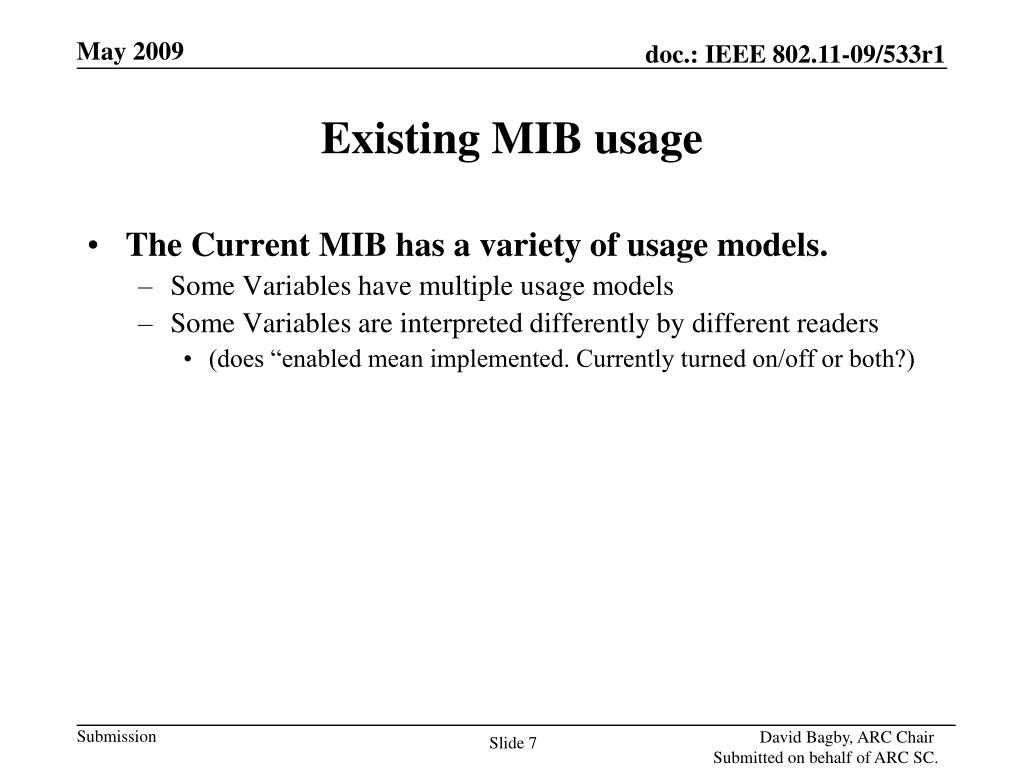 Existing MIB usage • The Current MIB has a variety of usage models. • Some Variables have multiple usage models • Some Variables are interpreted differently by different readers • (does “enabled mean implemented. Currently turned on/off or both?)