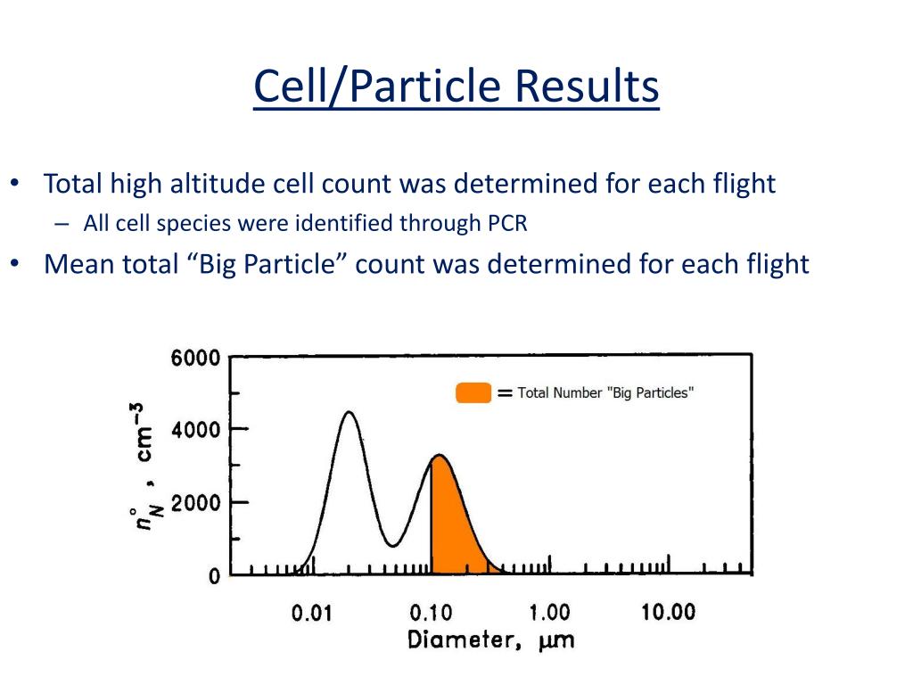 Cell/Particle Results • Total high altitude cell count was determined for each flight • All cell species were identified through PCR • Mean total “Big Particle” count was determined for each flight