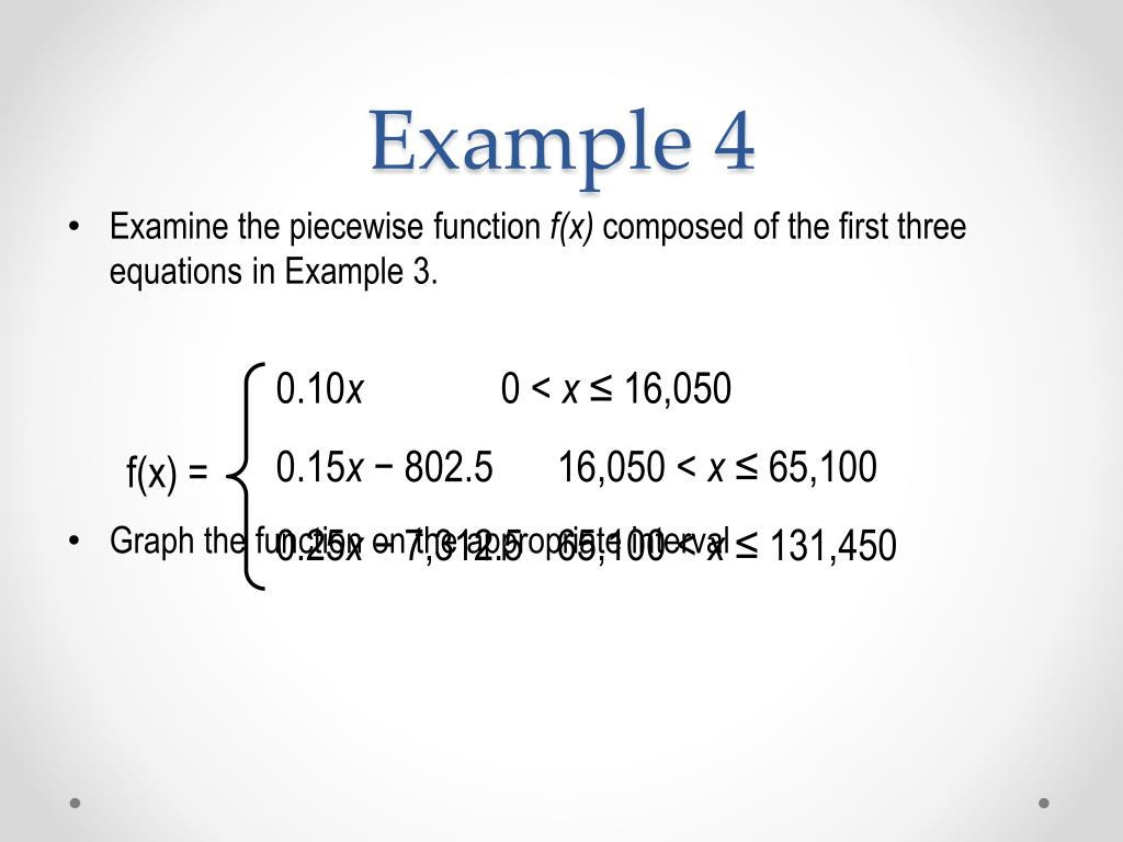 Example 4 0.10x 0 < x ≤ 16,050 0.15x − 802.5 16,050 < x ≤ 65,100 0.25x − 7,312.5 65,100 < x ≤ 131,450 f(x) = • Examine the piecewise function f(x) composed of the first three equations in Example 3. • Graph the function on the appropriate interval