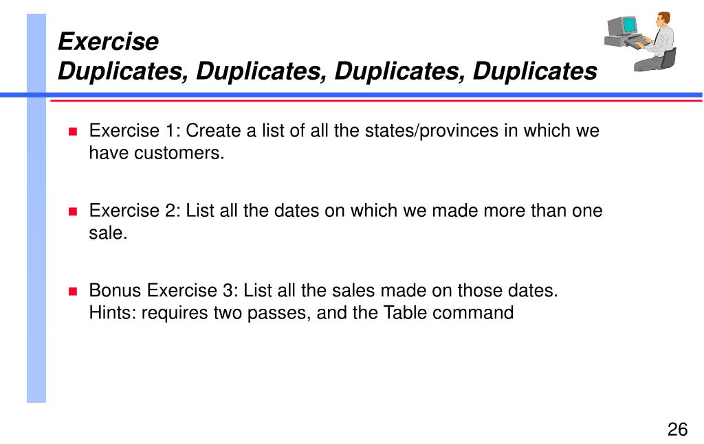 ExerciseDuplicates, Duplicates, Duplicates, Duplicates • Exercise 1: Create a list of all the states/provinces in which we have customers. • Exercise 2: List all the dates on which we made more than one sale. • Bonus Exercise 3: List all the sales made on those dates.Hints: requires two passes, and the Table command 26
