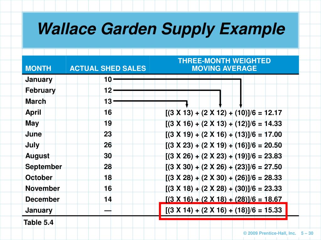 (10 + 12 + 13)/3 = 11.67 (12 + 13 + 16)/3 = 13.67 (13 + 16 + 19)/3 = 16.00 (16 + 19 + 23)/3 = 19.33 (19 + 23 + 26)/3 = 22.67 (23 + 26 + 30)/3 = 26.33 (26 + 30 + 28)/3 = 28.00 (30 + 28 + 18)/3 = 25.33 (28 + 18 + 16)/3 = 20.67 (18 + 16 + 14)/3 = 16.00 Wallace Garden Supply Example Table 5.3