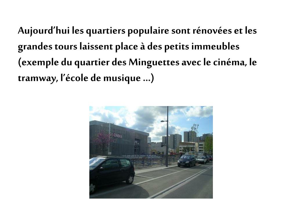 Aujourd’hui les quartiers populaire sont rénovées et les grandes tours laissent place à des petits immeubles (exemple du quartier des Minguettes avec le cinéma, le tramway, l’école de musique …)