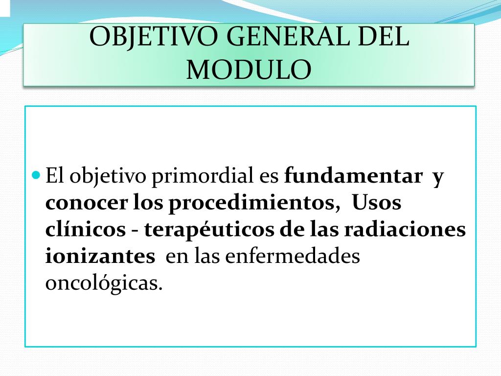OBJETIVO GENERAL DEL MODULO • El objetivo primordial es fundamentar y conocer los procedimientos, Usos clínicos - terapéuticos de las radiaciones ionizantes en las enfermedades oncológicas.