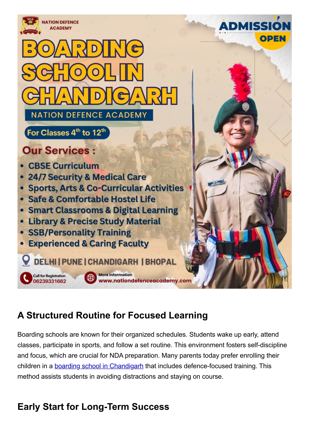 A Structured Routine for Focused Learning Boarding schools are known for their organized schedules. Students wake up early, attend classes, participate in sports, and follow a set routine. This environment fosters self-discipline and focus, which are crucial for NDA preparation. Many parents today prefer enrolling their children in a boarding school in Chandigarh that includes defence-focused training. This method assists students in avoiding distractions and staying on course. Early Start for Long-Term Success