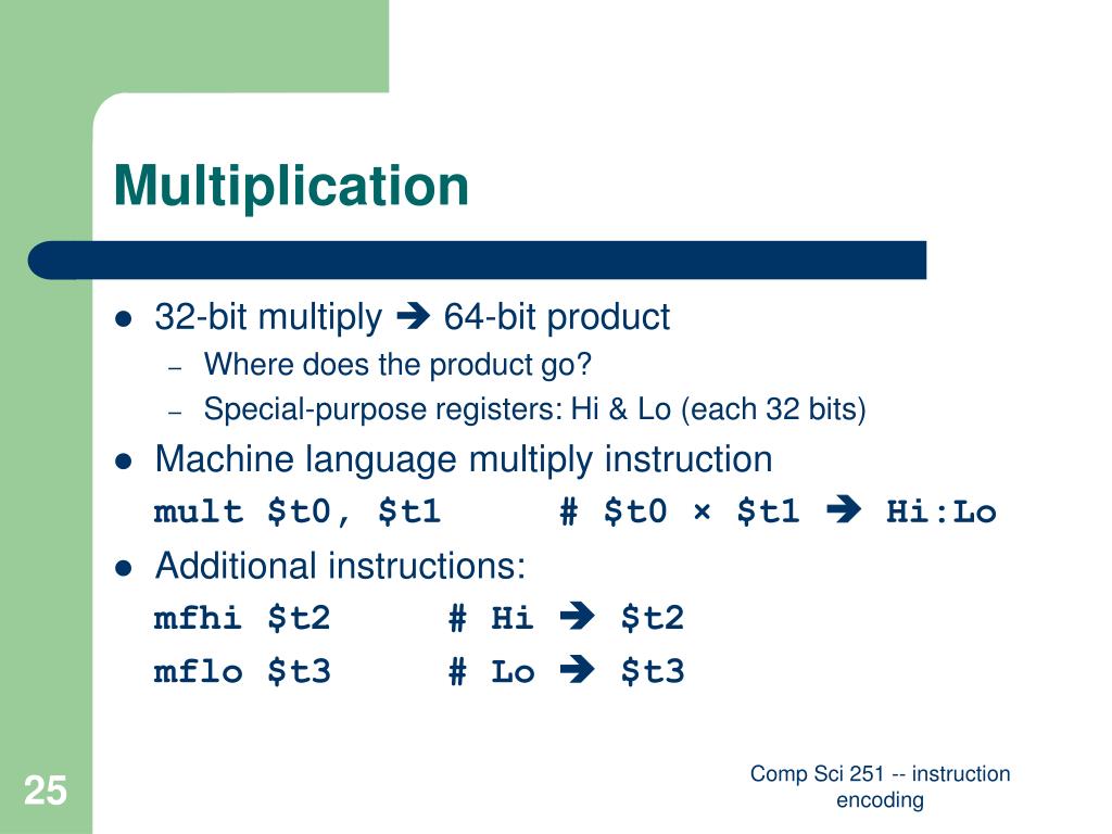 Multiplication • 32-bit multiply 64-bit product • Where does the product go? • Special-purpose registers: Hi & Lo (each 32 bits) • Machine language multiply instruction mult $t0, $t1 # $t0 × $t1 Hi:Lo • Additional instructions: mfhi $t2 # Hi $t2 mflo $t3 # Lo $t3 Comp Sci 251 -- instruction encoding