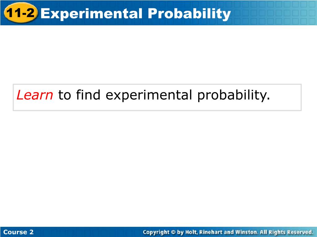 Experimental Probability. 11-2. Course 2. Warm Up. Problem of the Day. Lesson Presentation. Experimental Probability. 11-2. Course 2. Warm Up 1. A jar contains 6 red, 8 blue, and 10 white marbles. Would you be more likely to pull out a red or a blue marble?