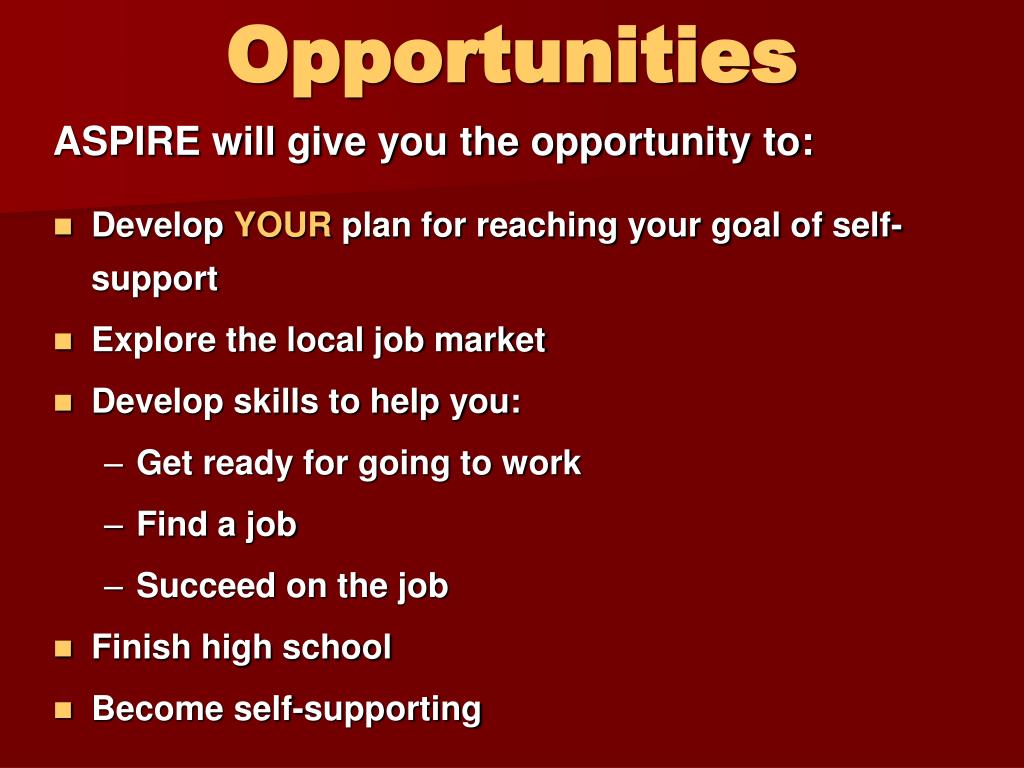 Opportunities ASPIRE will give you the opportunity to: • Develop YOUR plan for reaching your goal of self-support • Explore the local job market • Develop skills to help you: • Get ready for going to work • Find a job • Succeed on the job • Finish high school • Become self-supporting