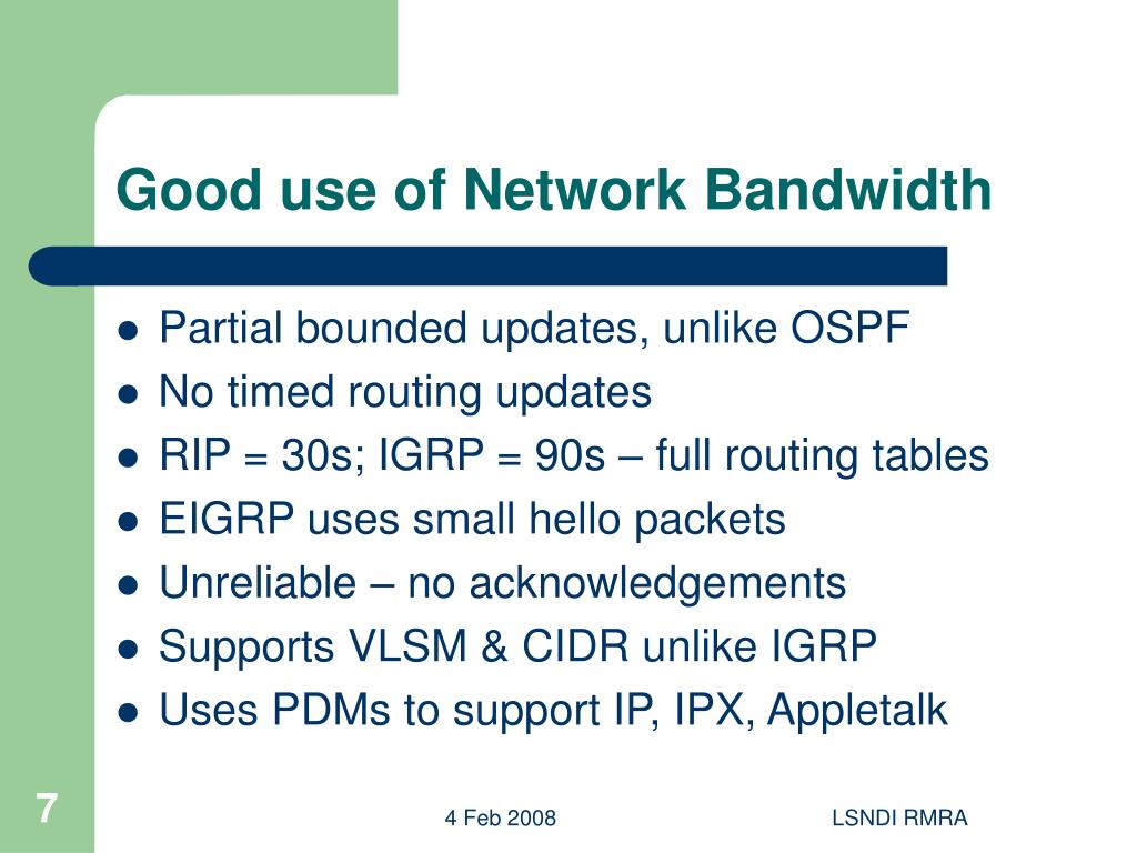 Good use of Network Bandwidth • Partial bounded updates, unlike OSPF • No timed routing updates • RIP = 30s; IGRP = 90s – full routing tables • EIGRP uses small hello packets • Unreliable – no acknowledgements • Supports VLSM & CIDR unlike IGRP • Uses PDMs to support IP, IPX, Appletalk LSNDI RMRA