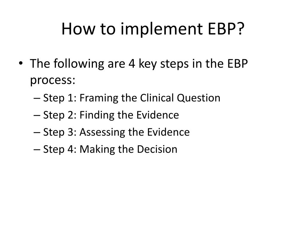 How to implement EBP? • The following are 4 key steps in the EBP process: • Step 1: Framing the Clinical Question • Step 2: Finding the Evidence • Step 3: Assessing the Evidence • Step 4: Making the Decision