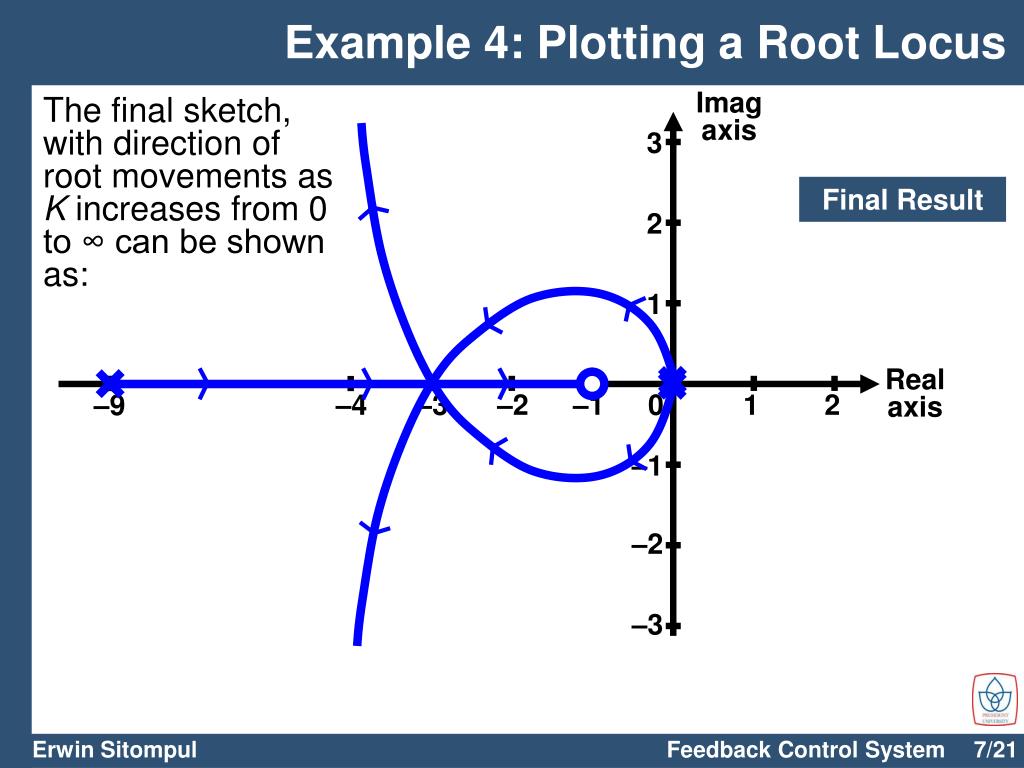 Imagaxis 3 2 1 Realaxis –4 –3 –2 –1 0 1 2 –9 –1 –2 –3 Example 4: Plotting a Root Locus The final sketch, with direction of root movements as K increases from 0 to ∞ can be shown as: Final Result