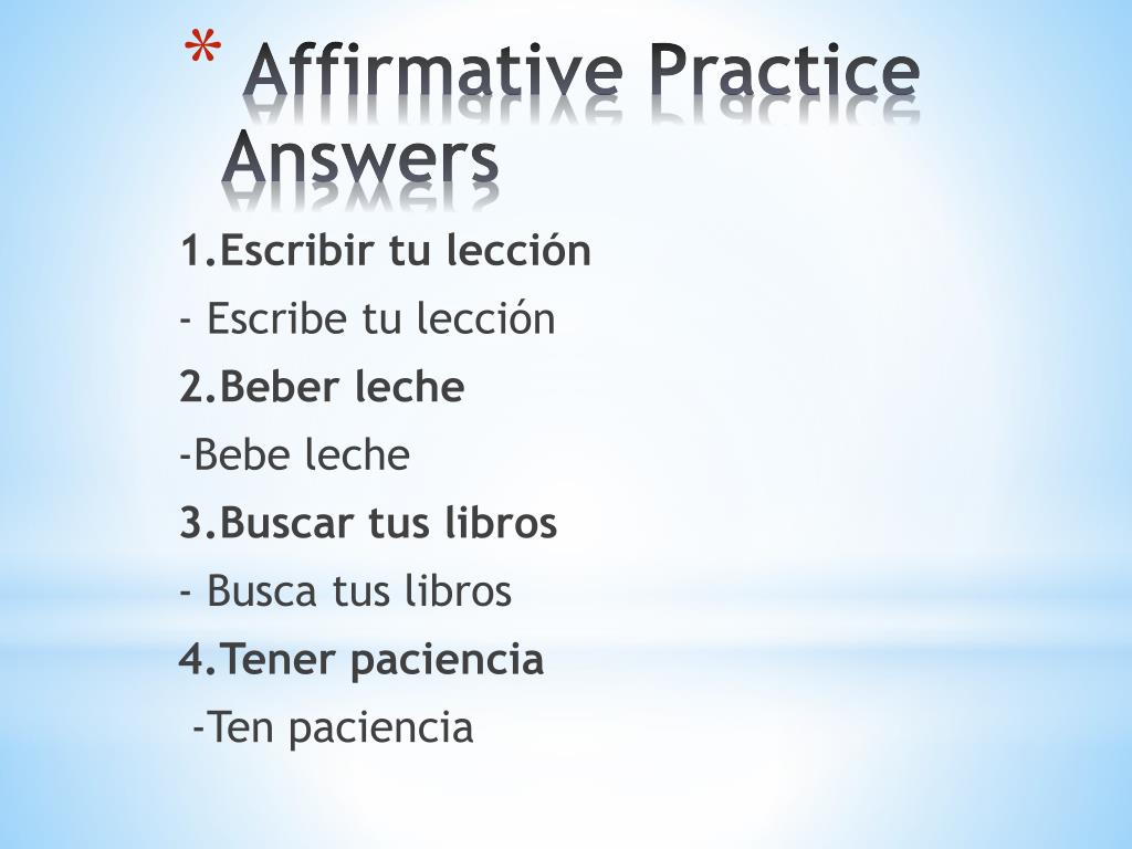 1.Escribir tu lección - Escribe tu lección 2.Beber leche -Bebe leche 3.Buscar tus libros - Busca tus libros 4.Tener paciencia -Ten paciencia Affirmative Practice Answers