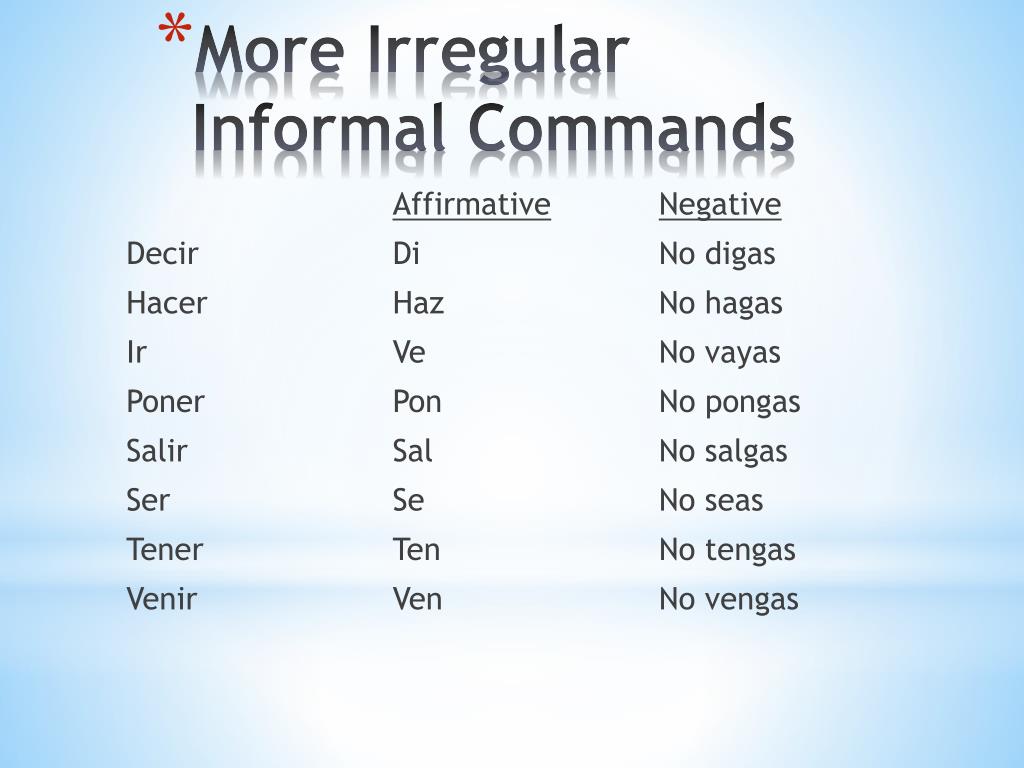 Decir Hacer Ir Poner Salir Ser Tener Venir Affirmative Di Haz Ve Pon Sal Se Ten Ven Negative No digas No hagas No vayas No pongas No salgas No seas No tengas No vengas More Irregular Informal Commands