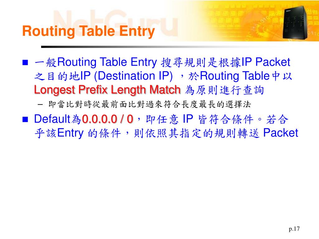 Routing Table Entry • 一般Routing Table Entry 搜尋規則是根據IP Packet之目的地IP (Destination IP) ,於Routing Table中以Longest Prefix Length Match為原則進行查詢 • 即當比對時從最前面比對過來符合長度最長的選擇法 • Default為0.0.0.0 / 0,即任意 IP 皆符合條件。若合乎該Entry 的條件,則依照其指定的規則轉送 Packet