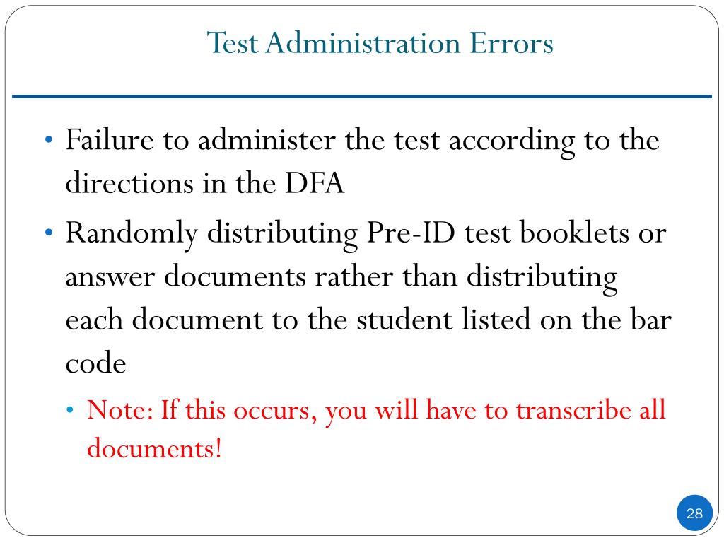 Test Administration Errors • Failure to administer the test according to the directions in the DFA • Randomly distributing Pre-ID test booklets or answer documents rather than distributing each document to the student listed on the bar code • Note: If this occurs, you will have to transcribe all documents!