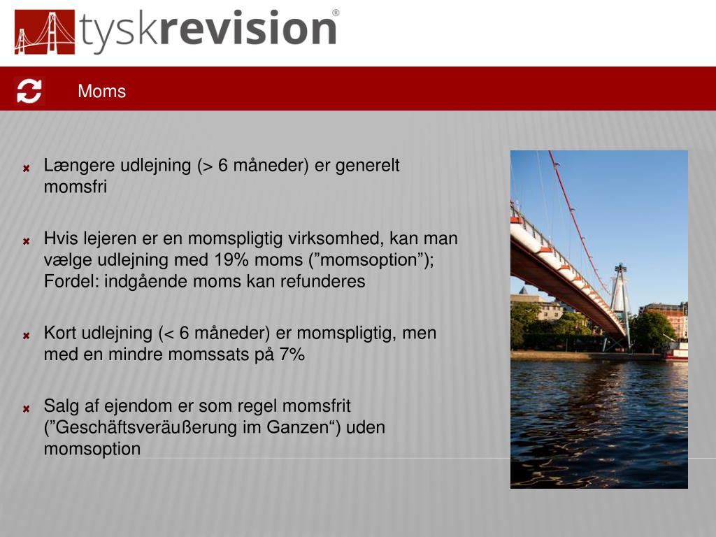 Længere udlejning (> 6 måneder) er generelt momsfri Hvis lejeren er en momspligtig virksomhed, kan man vælge udlejning med 19% moms (”momsoption”); Fordel: indgående moms kan refunderes Kort udlejning (< 6 måneder) er momspligtig, men med en mindre momssats på 7% Salg af ejendom er som regel momsfrit (”Geschäftsveräußerung im Ganzen“) uden momsoption Moms