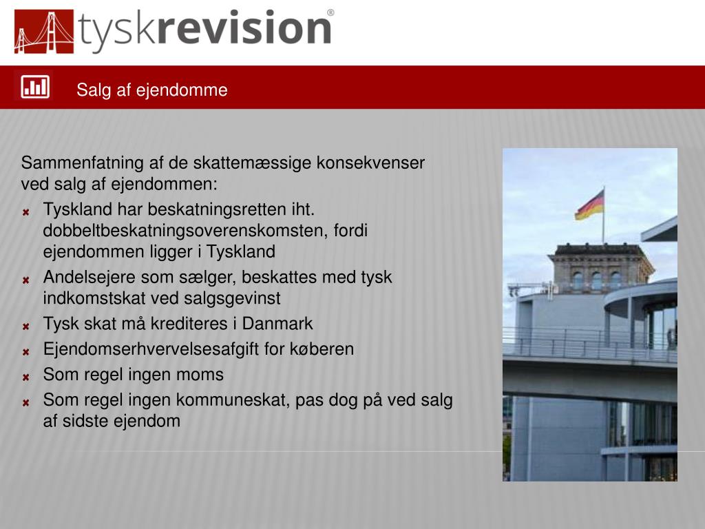 Sammenfatning af de skattemæssige konsekvenser ved salg af ejendommen: Tyskland har beskatningsretten iht. dobbeltbeskatningsoverenskomsten, fordi ejendommen ligger i Tyskland Andelsejere som sælger, beskattes med tysk indkomstskat ved salgsgevinst Tysk skat må krediteres i Danmark Ejendomserhvervelsesafgift for køberen Som regel ingen moms Som regel ingen kommuneskat, pas dog på ved salg af sidste ejendom Salg af ejendomme