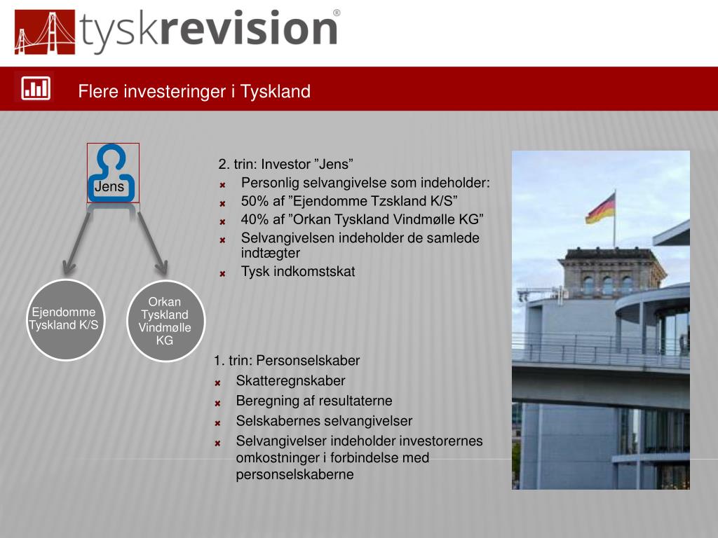 Flere investeringer i Tyskland 2. trin: Investor ”Jens” Personlig selvangivelse som indeholder: 50% af ”Ejendomme Tzskland K/S” 40% af ”Orkan Tyskland Vindmølle KG” Selvangivelsen indeholder de samlede indtægter Tysk indkomstskat Jens • EjendommeTyskland K/S • Orkan TysklandVindmølle KG 1. trin: Personselskaber Skatteregnskaber Beregning af resultaterne Selskabernes selvangivelser Selvangivelser indeholder investorernes omkostninger i forbindelse med personselskaberne