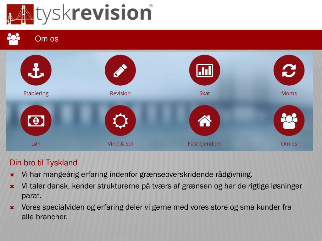 Din bro til Tyskland Vi har mangeårig erfaring indenfor grænseoverskridende rådgivning. Vi taler dansk, kender strukturerne på tværs af grænsen og har de rigtige løsninger parat. Vores specialviden og erfaring deler vi gerne med vores store og små kunder fra alle brancher. Om os