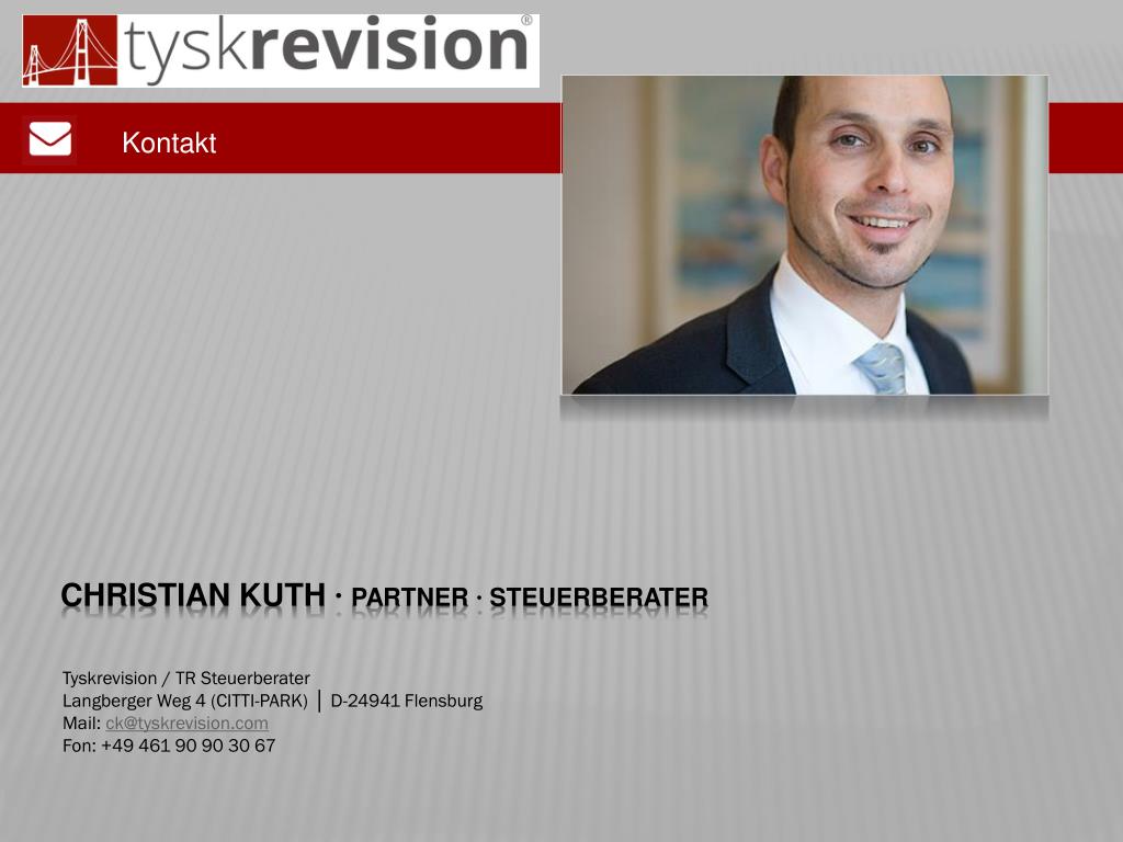 Kontakt Christian kuth∙partner ∙ steuerberater Tyskrevision / TR Steuerberater Langberger Weg 4 (CITTI-PARK) │ D-24941 Flensburg Mail: ck@tyskrevision.com Fon: +49 461 90 90 30 67