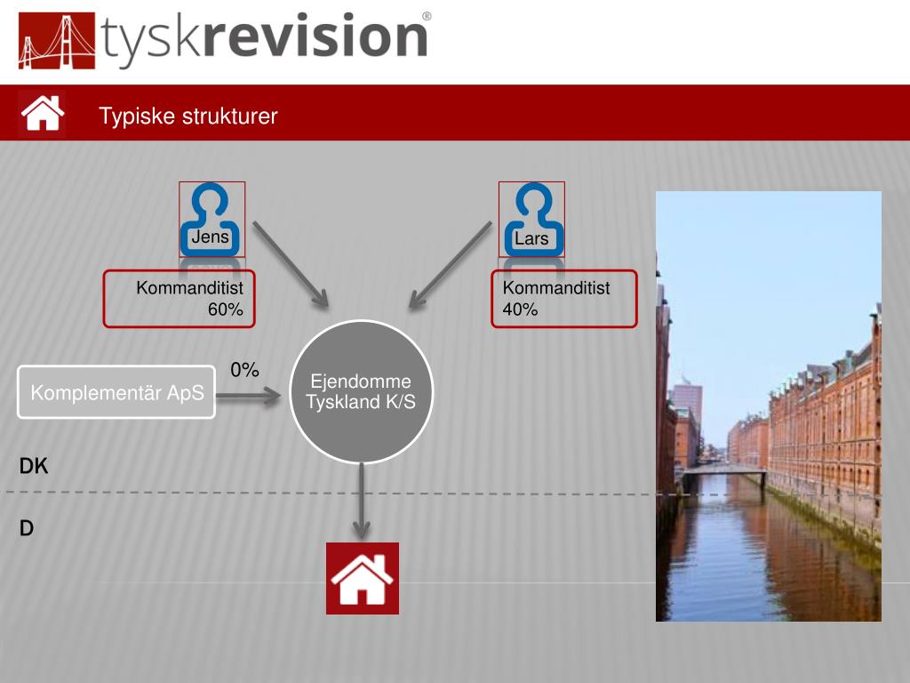 EjendommeTyskland K/S • Komplementär ApS Typiskestrukturer Jens Lars Kommanditist 60% Kommanditist 40% 0% DK D