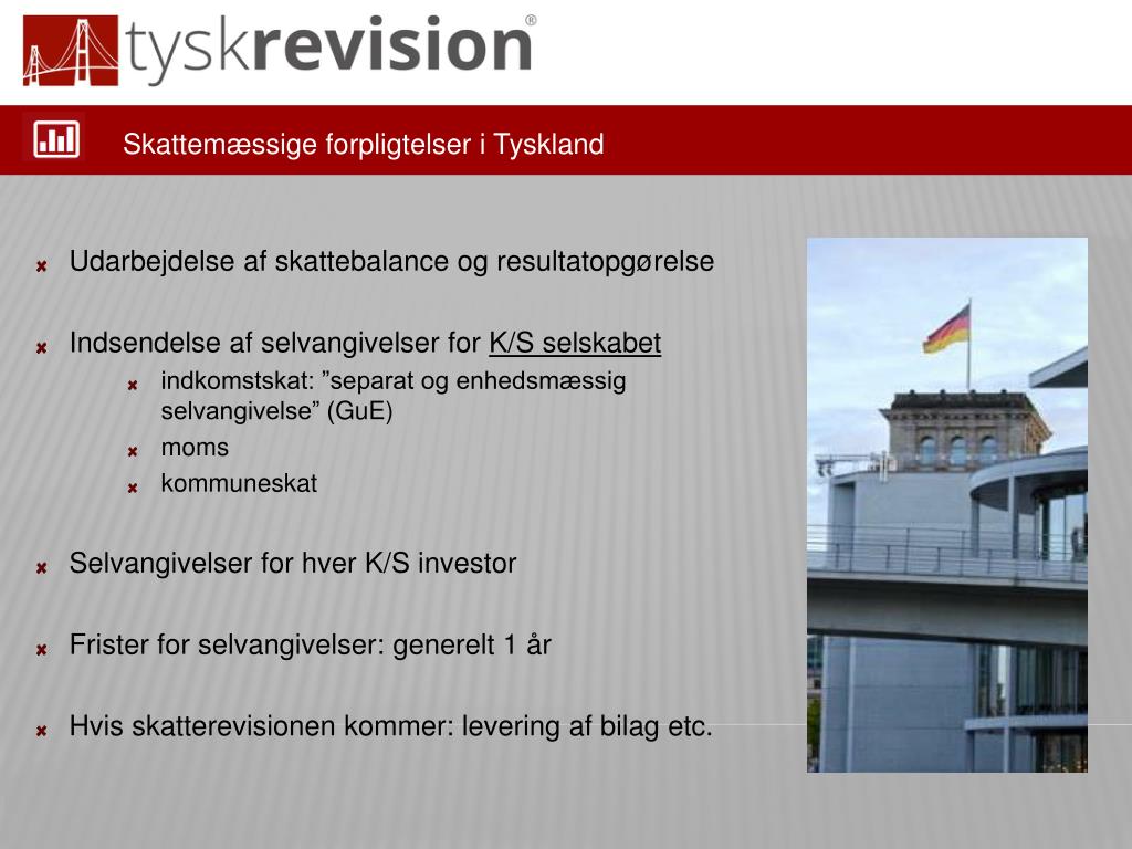 Udarbejdelse af skattebalance og resultatopgørelse Indsendelse af selvangivelser for K/S selskabet indkomstskat: ”separat og enhedsmæssig selvangivelse” (GuE) moms kommuneskat Selvangivelser for hver K/S investor Frister for selvangivelser: generelt 1 år Hvis skatterevisionen kommer: levering af bilag etc. Skattemæssige forpligtelser i Tyskland