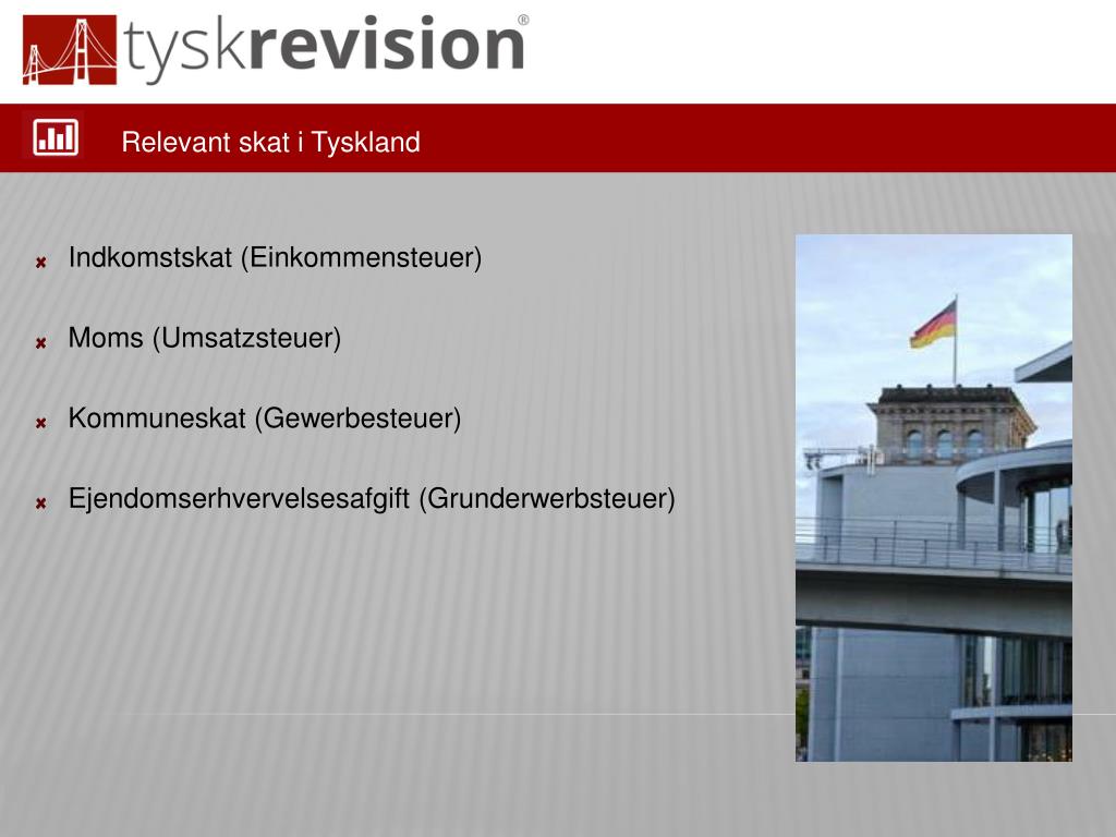 Indkomstskat (Einkommensteuer) Moms (Umsatzsteuer) Kommuneskat (Gewerbesteuer) Ejendomserhvervelsesafgift (Grunderwerbsteuer) Relevant skat i Tyskland