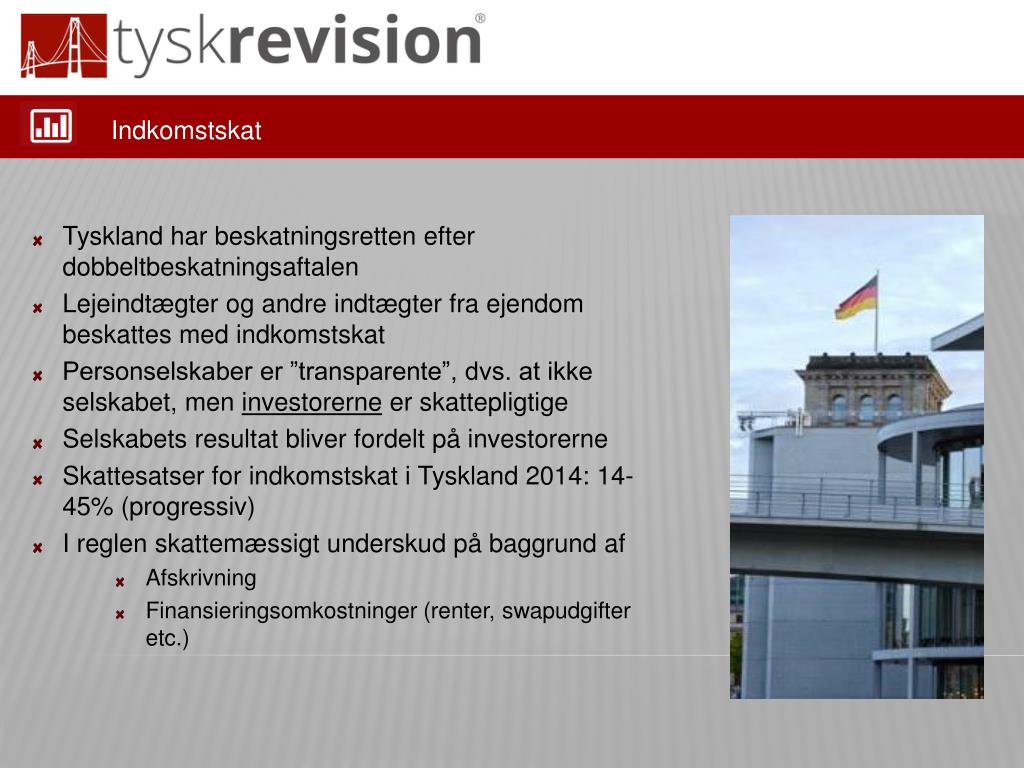 Tyskland har beskatningsretten efter dobbeltbeskatningsaftalen Lejeindtægter og andre indtægter fra ejendom beskattes med indkomstskat Personselskaber er ”transparente”, dvs. at ikke selskabet, men investorerne er skattepligtige Selskabets resultat bliver fordelt på investorerne Skattesatser for indkomstskat i Tyskland 2014: 14-45% (progressiv) I reglen skattemæssigt underskud på baggrund af Afskrivning Finansieringsomkostninger (renter, swapudgifter etc.) Indkomstskat