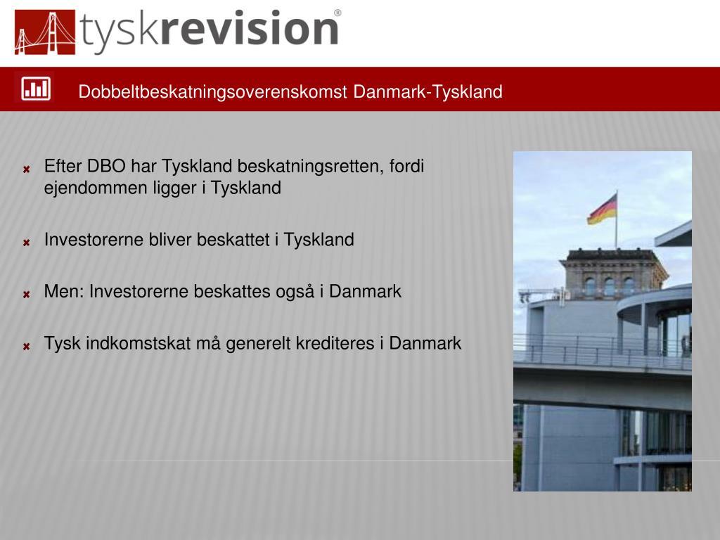 Efter DBO har Tyskland beskatningsretten, fordi ejendommen ligger i Tyskland Investorerne bliver beskattet i Tyskland Men: Investorerne beskattes også i Danmark Tysk indkomstskat må generelt krediteres i Danmark Dobbeltbeskatningsoverenskomst Danmark-Tyskland