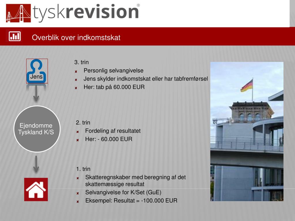 3. trin Personlig selvangivelse Jens skylder indkomstskat eller har tabfremførsel Her: tab på 60.000 EUR Overblik over indkomstskat Jens • EjendommeTyskland K/S 2. trin Fordeling af resultatet Her: - 60.000 EUR 1. trin Skatteregnskaber med beregning af det skattemæssige resultat Selvangivelse for K/Set (GuE) Eksempel: Resultat = -100.000 EUR