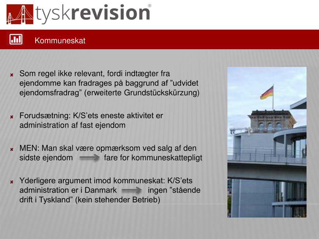 Som regel ikke relevant, fordi indtægter fra ejendomme kan fradrages på baggrund af ”udvidet ejendomsfradrag” (erweiterteGrundstückskürzung) Forudsætning: K/S’ets eneste aktivitet er administration af fast ejendom MEN: Man skal være opmærksom ved salg af den sidste ejendom fare for kommuneskattepligt Yderligere argument imod kommuneskat: K/S’ets administration er i Danmark ingen ”stående drift i Tyskland” (kein stehender Betrieb) Kommuneskat