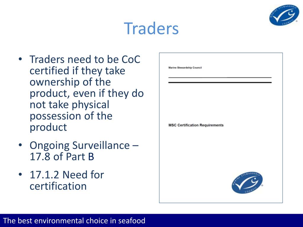 Traders • Traders need to be CoC certified if they take ownership of the product, even if they do not take physical possession of the product • Ongoing Surveillance – 17.8 of Part B • 17.1.2 Need for certification