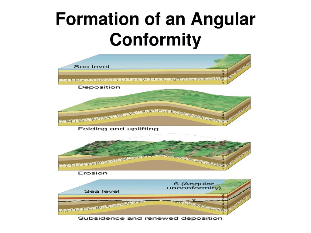 Unconformities • An unconformity represents a long period during which deposition stopped, erosion removed previously formed rocks, and then deposition resumed. 1. An angular unconformity indicates a period of deformation (folding or tilting) and erosion occurred.