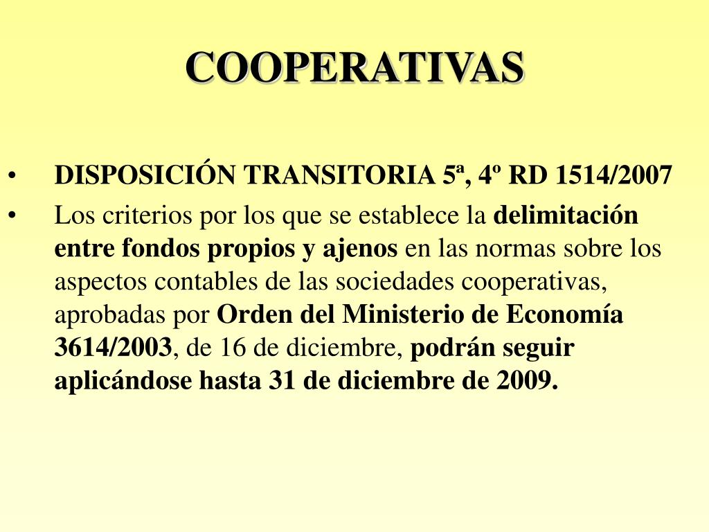 COOPERATIVAS • DISPOSICIÓN TRANSITORIA 5ª, 4º RD 1514/2007 • Los criterios por los que se establece la delimitación entre fondos propios y ajenos en las normas sobre los aspectos contables de las sociedades cooperativas, aprobadas por Orden del Ministerio de Economía 3614/2003, de 16 de diciembre, podrán seguir aplicándose hasta 31 de diciembre de 2009.