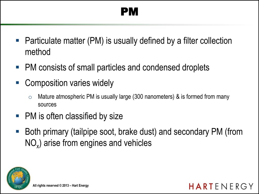 PM • Particulate matter (PM) is usually defined by a filter collection method • PM consists of small particles and condensed droplets • Composition varies widely • Mature atmospheric PM is usually large (300 nanometers) & is formed from many sources • PM is often classified by size • Both primary (tailpipe soot, brake dust) and secondary PM (from NOx) arise from engines and vehicles